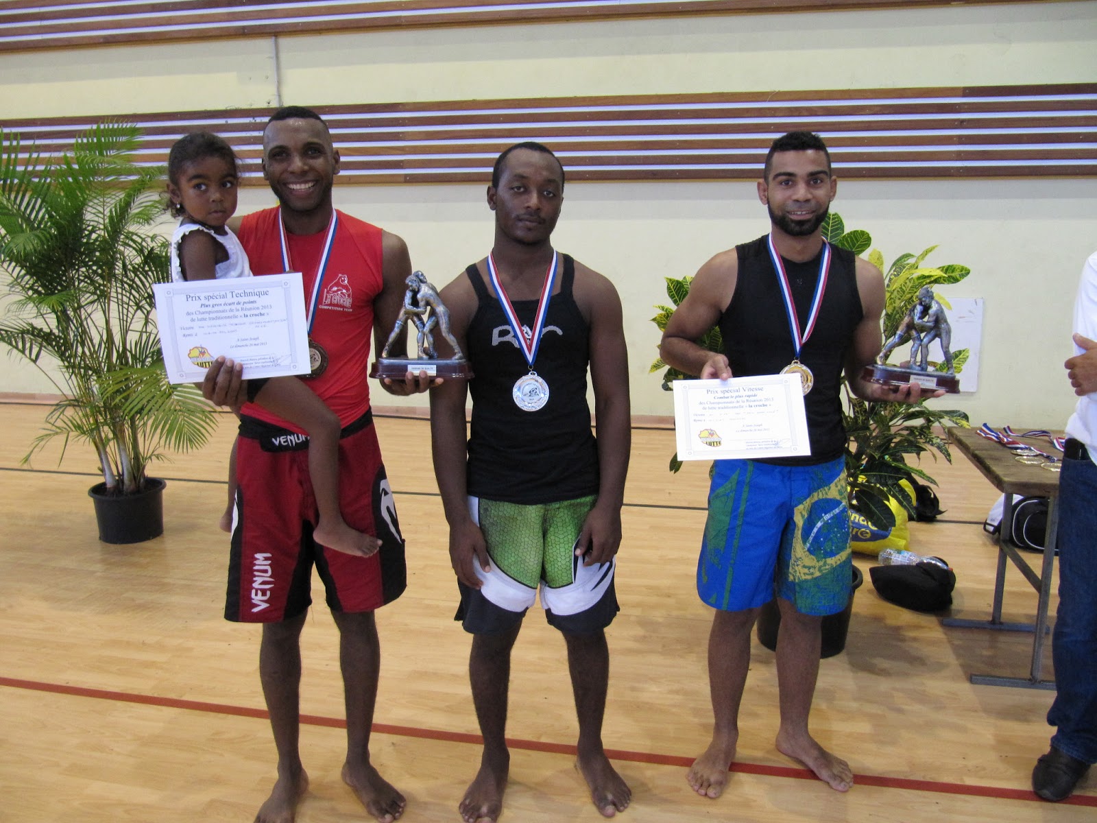 Troisièmes ex-aequo, les doubles champions de la Réunion sont : - Yves "Charlie" Preira (du Lutte/Grappling Saint-Pierre): 2008 et 2009 chez les 96kg - Tonny Verbard (du Lutte Croche Bois de Nèfles Saint-Paul) : 2008 et 2009 chez les 60kg - Fabrice Lucas (du Club de Lutte Paul Jouglas) : 2011 et 2012 chez les 84kg - et Frédéric Audebert (du Lutte Club Saint-Joseph) : 2012 chez les 74kg et 2013 chez les 66kg.