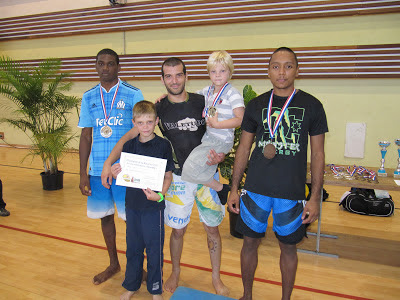 Podium de la très relevée catégorie des 66kg. De gauche à droite : Emmanuel Imoucha, auteur du KO le plus rapide à l'IOFC, en pancrace (2ème), Frédéric Audebert et ses petits cousins, champion de croche en titre des 74kg descendu chez les 66kg (1er ...réalisant ainsi une doublé inédit), et Aymeric Salambo, 5ème des championnats de France 2013 de sambo combat (3ème).