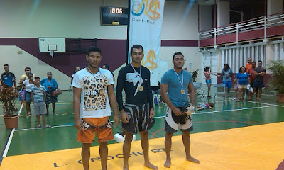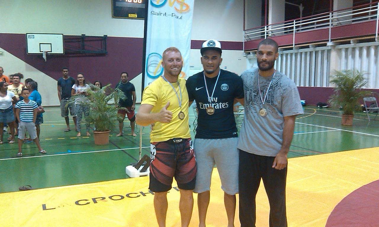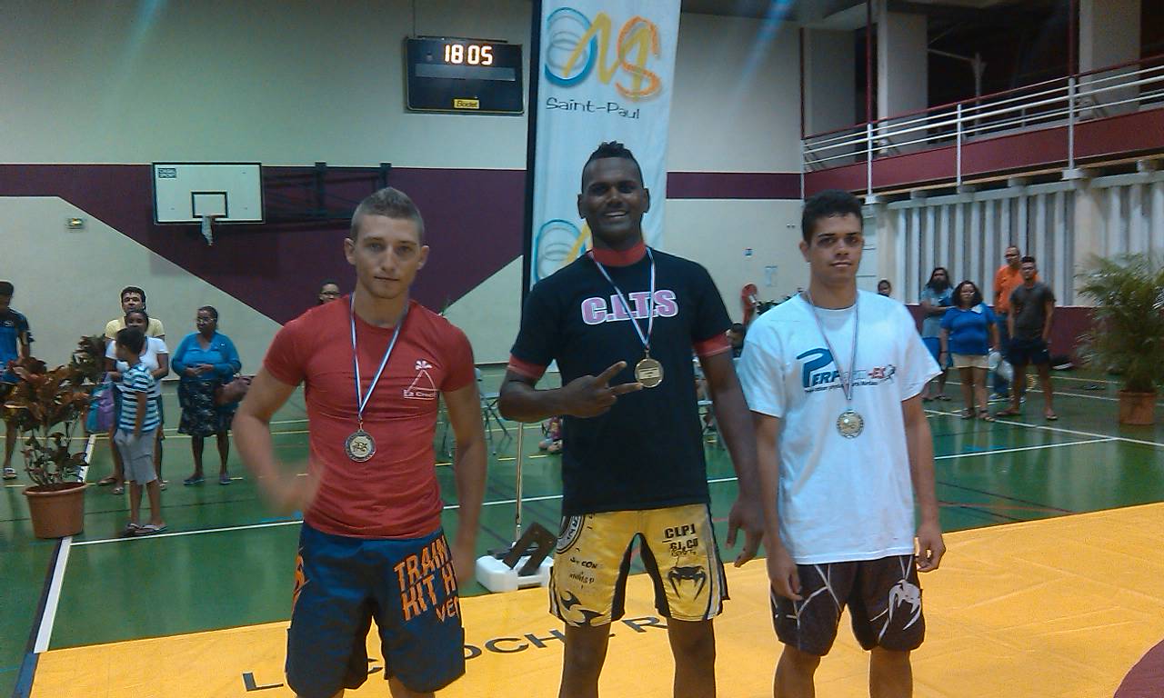 le 26/05/2016 @ 19:21 Catégorie 59 kg : 1- Sébastien Turpin (Grapplers Sud) 2- Dylan Latchimy-Anandy (La croche Bois de Nèfles + CLTS) 3- Farid Sidanbarom (Idée Verte) Catégorie 65kg : 1- Lewis Bordier (Perform-Es) 2- représenté sur le podium par un ami : Jules Vanpeperstraete (AWCKJKDMV) 3- Théo Payet (Grapplers Sud) Catégorie 71kg 1- Wilfrid Sellaye (CLTS + La croche Bois de Nèfles) 2- Fabien Carron (Perform-Es) 3- Thomas Payet (Idée Verte) Catégorie 77kg : 1- Anthony Lebreton (AWCKJKDMV) 2- Morgan Fontaine (Cercle Sudiste) 3- Allan Robert (La croche Bois de Nèfles + CLTS) Catégorie 84kg : 1- Nicolas "Tico" Grondin (Cercle Sudiste) 2- Brahim Leroux (Perform-Es) 3- Olivier "Ti Rouge" Elisabeth (La croche Bois de Nèfles + CLTS) Catégorie 92kg 1- Christopher Armouet (La croche Bois de Nèfles + CLTS) 2- Olivier Vellayoudom (Cercle Sudiste) 3 exaequo - Merrick Félicité (La croche Bois de Nèfles + CLTS) et Stéphane Payet (Grapplers Sud) Catégorie 100kg 1- Loïc Bijoux (Grapplers Sud) 2- Jonas Hoareau (Cercle Sudiste) 3- représenté par Lino Charlettine : Mathieu Grondin (La croche pour le développement de l'Etang Saint-Paul) Classement par club 1- La croche Bois de Nèfles Saint-Paul (de Jean-Pierre Tarley) associée à Club Lutteur Team Sellaye (de Wilfrid Sellaye et Kévin Tiger) : 2 médailles d'or, 1 d'argent et 3 de bronze 2- Grapplers Sud (de Rémi Chane-To): 2 médailles d'or et 2 de bronze 3- Cercle Sudiste (d'Olivier Vellayoudom et Dominique Leichnig) : 1 médaille d'or et 3 d'argent