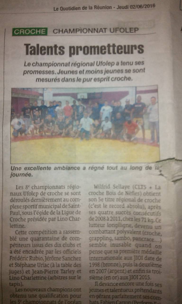 le 30/06/2016 @ 09:29 Les 3èmes championnats de l'océan Indien de croche auront lieu les 6 et 7 août 2016 à Tananarive (Antananarivo) à Madagascar. Les athlètes réunionnais sélectionnés pour cette compétition internationale sont : * Loïc Bijoux (Grapplers Sud), * Christopher Armouet (Lutte Croche Bois de Nèfles), * Nicolas "Tico" Grondin (Cercle Sudiste), * Anthony Lebreton (Association Win Chung Kali Jeet Kune Do Mont Vert), * Wilfrid Sellaye (Club Lutteur Team Sellaye), * Lewis Bordier (Perform-Es) * et Sébastien Turpin (Grapplers Sud). Le chef de délégation est le président de la Ligue de Croche : Lino Charlettine.