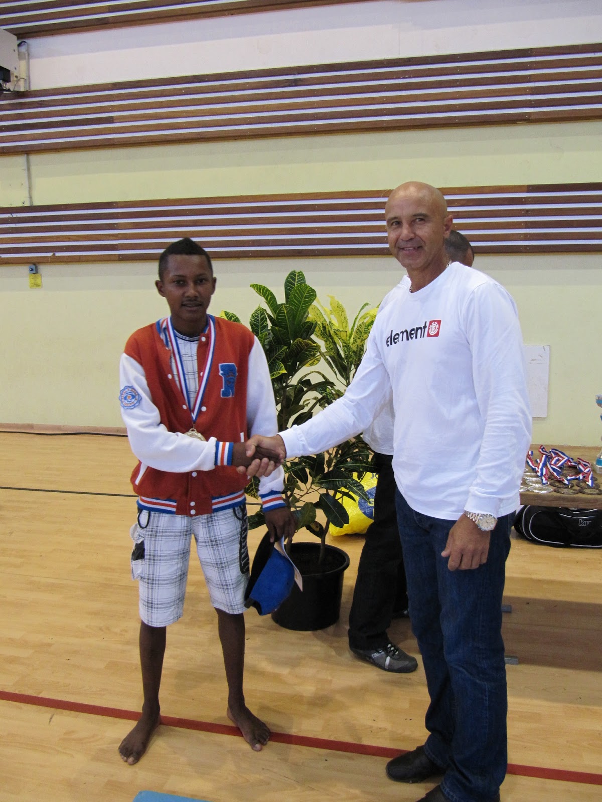 Le président du club de Saint-Joseph félicite Teddy Glenac, vainqueur chez les 55kg. La Réunion aura enfin un représentant dans cette catégorie pour aller défier les champions de la catégorie : Guyliane Bandou (Maurice) et Josen Jameer (Rodrigues).